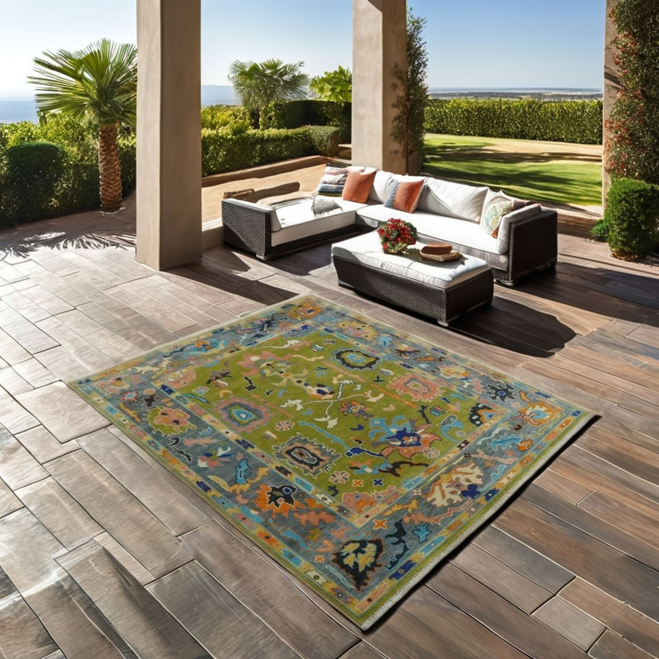 Tapis Oushak exclusif de haute qualité, noué à la main, motif floral en laine.