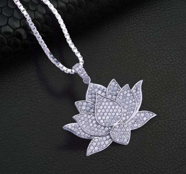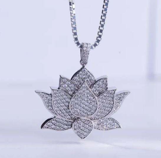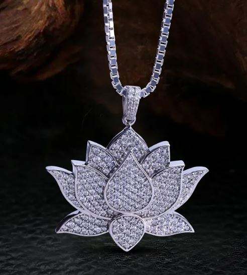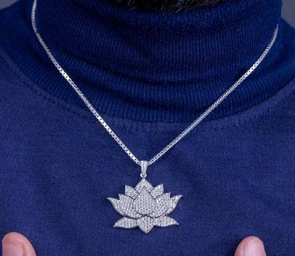 Collier Lotus Classique pour Homme Style Hip Hop Glacé en Argent Sterling 925 ZIRCON Bling, Cadeau Anthophile en Laiton