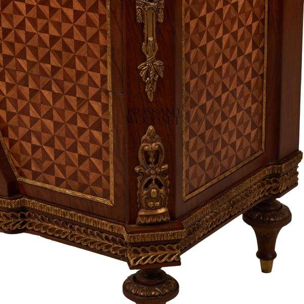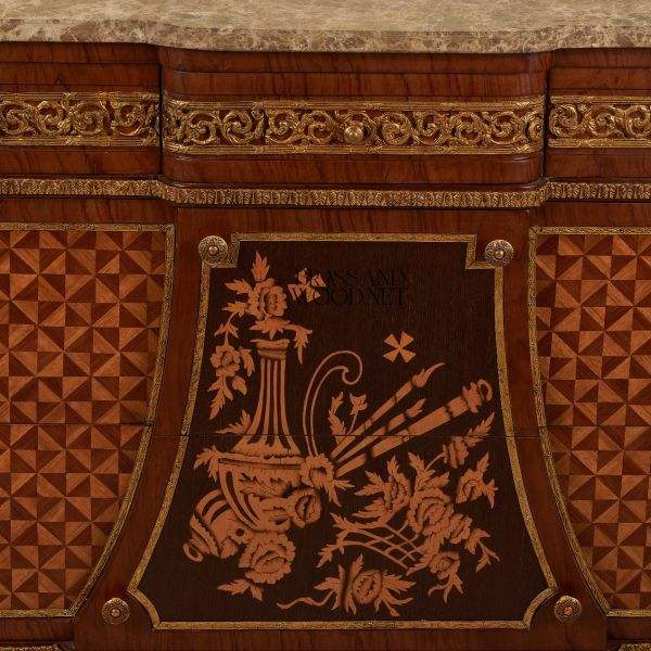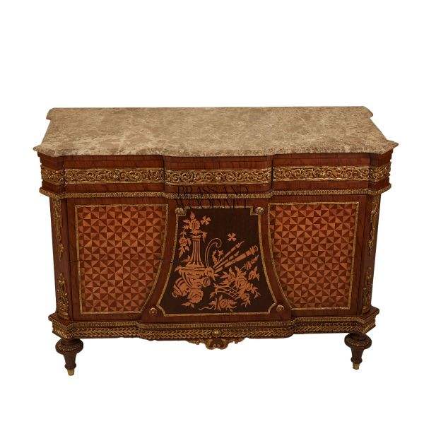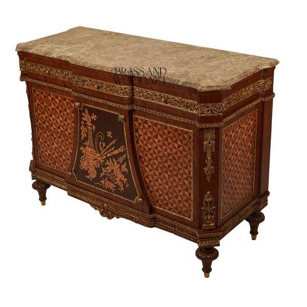 Console classique en bois incrusté avec plateau en marbre et panneaux décoratifs géométriques Console de rangement élégante et luxueuse