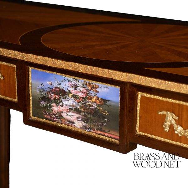 Table console classique en bois incrusté avec panneau central décoratif et accents en laiton, console élégante et luxueuse pour l'entrée