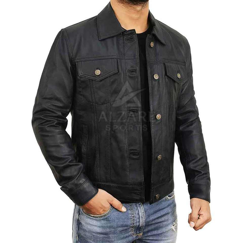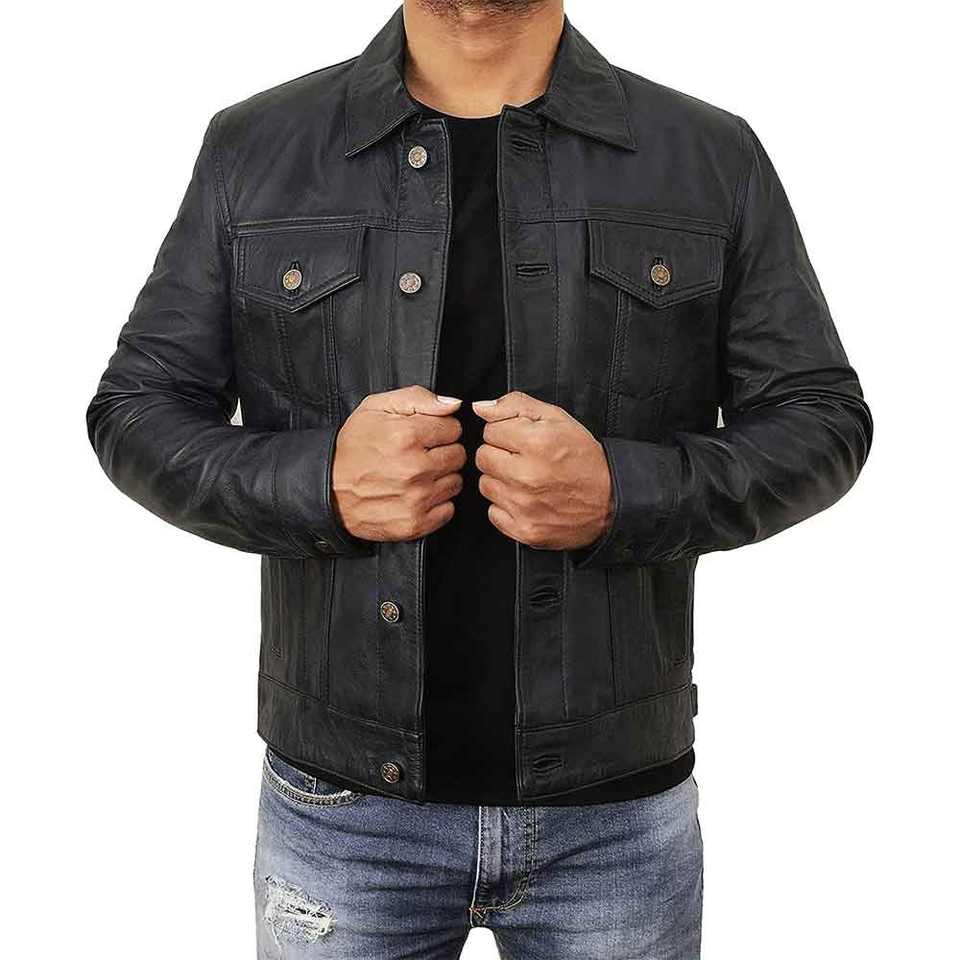 Veste de camionneur classique en cuir pour l'hiver, fermeture à boutons, coupe ajustée pour un look décontracté moderne.