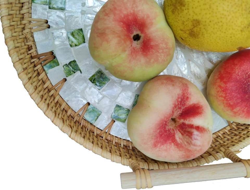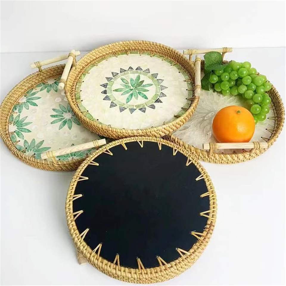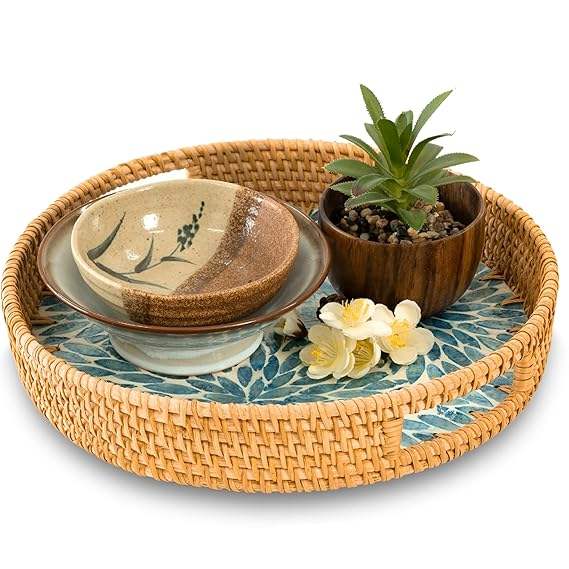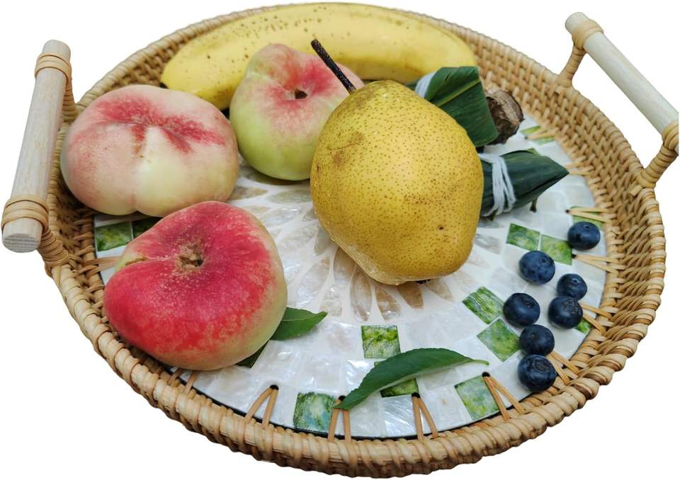 Plateau de service en rotin incrusté de nacre classique - Compatible lave-vaisselle, durable, multifonctionnel pour la cuisine et la décoration du salon