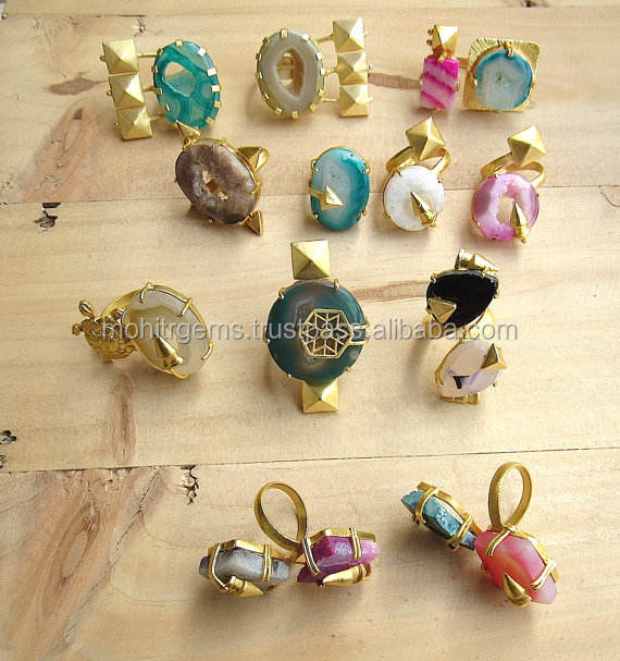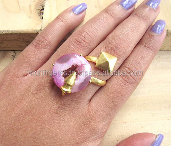 Bague en laiton agate géode rose classique avec balles en laiton bague de cocktail réglable en pierres précieuses pour fiançailles et fête