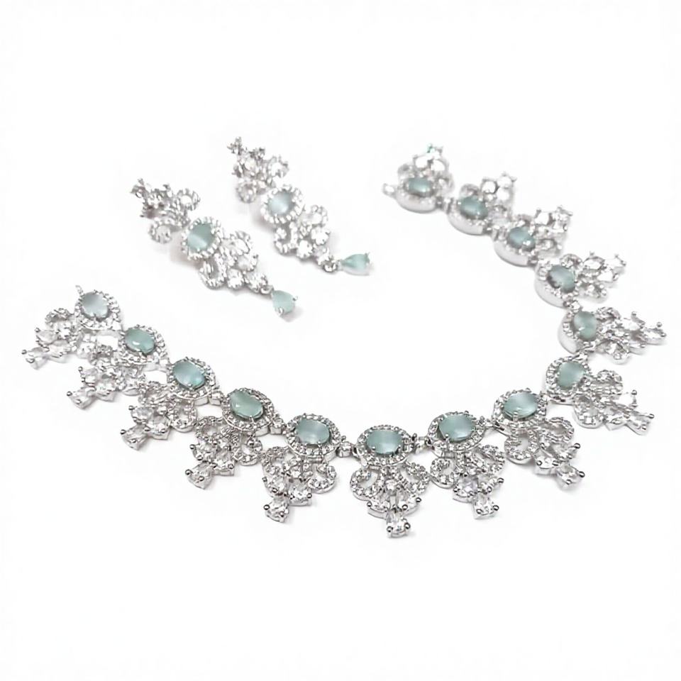 Ensemble collier et boucles d'oreilles en argent plaqué avec strass vert menthe de style royal classique, bijoux de mariage glamour pour les mariées