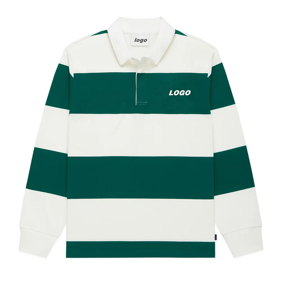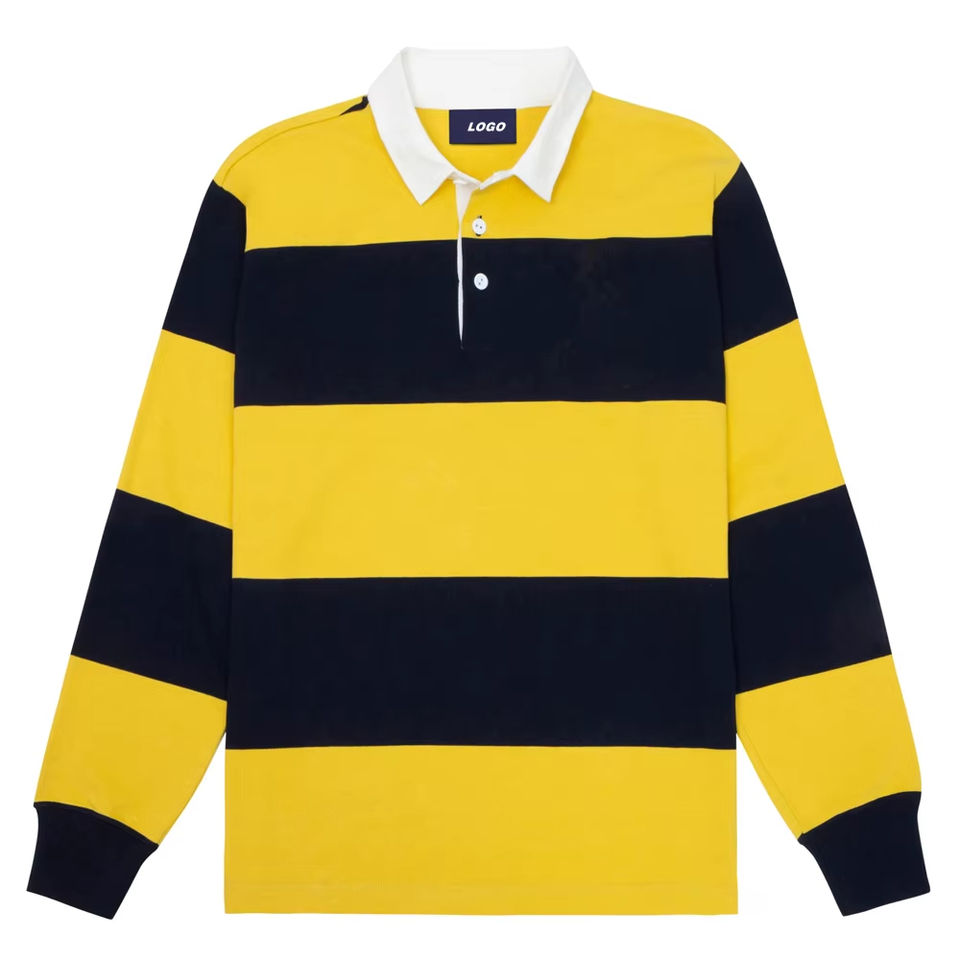 Chemise à manches longues de rugby classique Impression de logo personnalisé Matériau en coton lourd avec contraste de col et motif à rayures