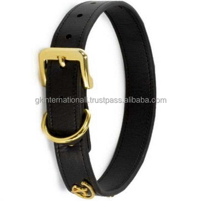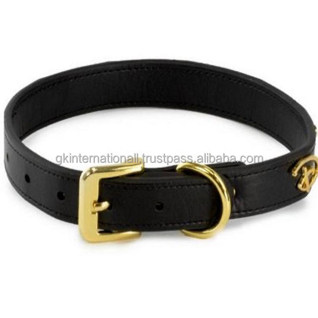 Collier de chien en cuir de qualité supérieure noir sur mesure de conception de signature classique avec des coutures de bord durables et du matériel en laiton plaqué or