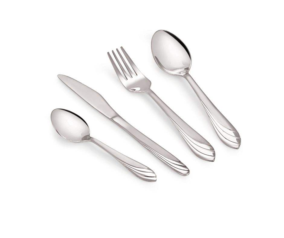 Ensemble de couverts classiques en acier inoxydable 4 pièces, finition miroir chromée, écologique, sans danger pour les aliments, ergonomique et à motifs