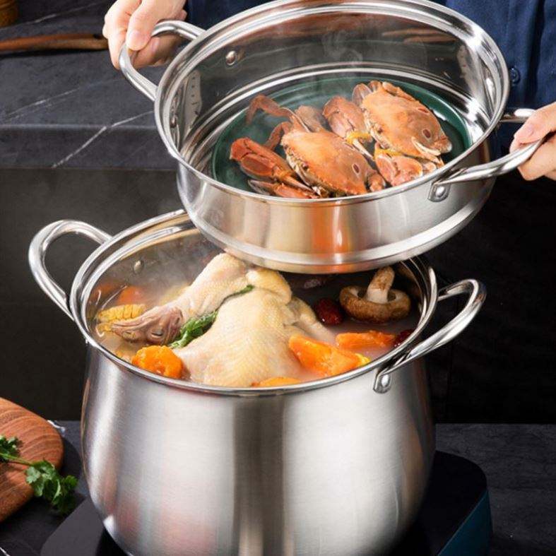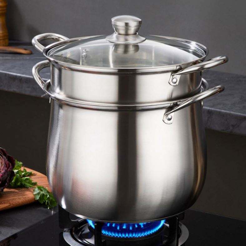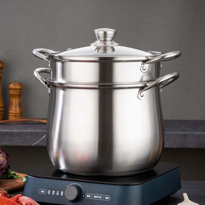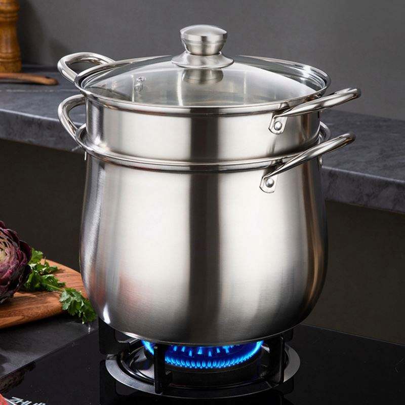 Marmite à soupe classique en acier inoxydable épaissi, grande capacité, anti-brûlure, double fond, couvercle en verre, compatible induction, pour la maison