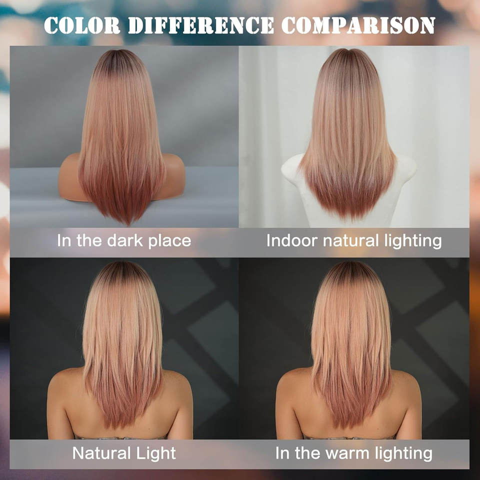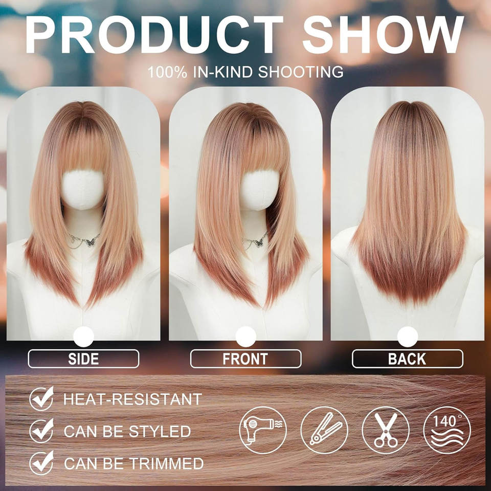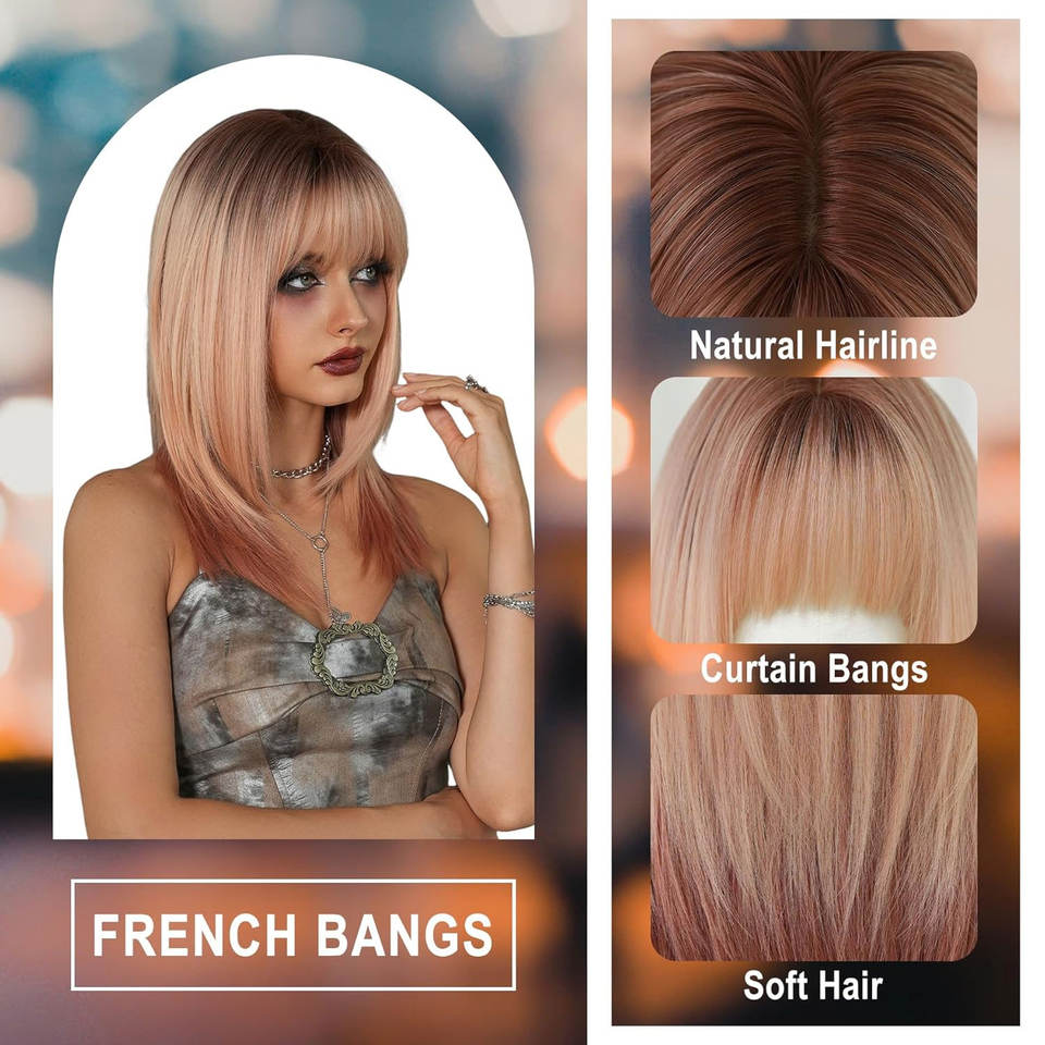 Classic Straight Brown Wig with Blonde Highlights and Bangs Soft Natural Looking Synthetic Wig