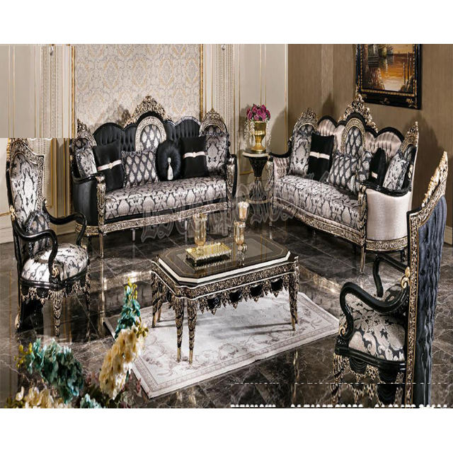 Collection de meubles de salon en bois massif de style classique, style roumain, canapé noir et or, style antique, ensemble de salon 8 places, Royaume-Uni