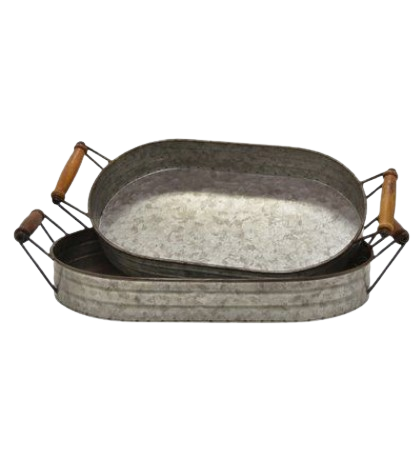 Plateau en métal de pièce maîtresse de table classique ensemble de deux plateau de service galvanisé vintage plateau de service galvanisé avec manche en bois