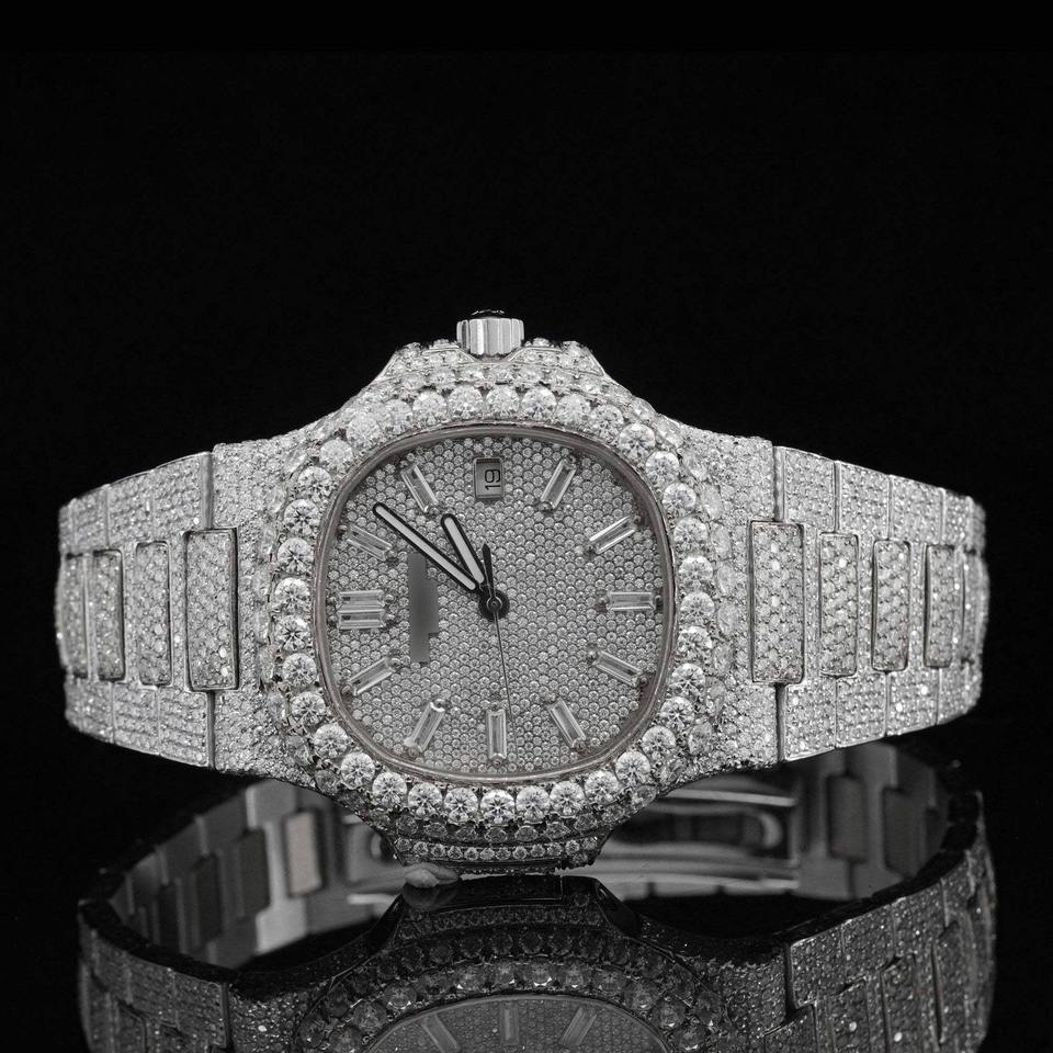 Montre automatique classique bicolore entièrement sertie de diamants de laboratoire, en acier inoxydable de luxe, style Bust Down, pour homme