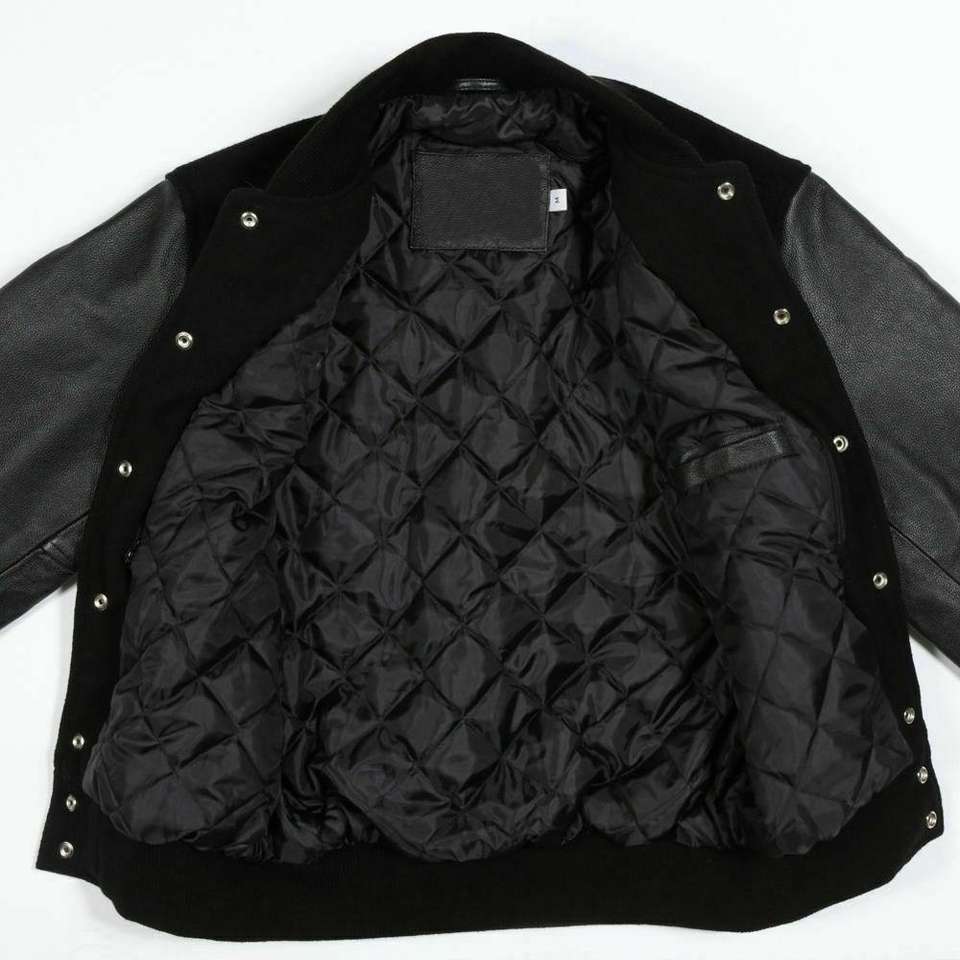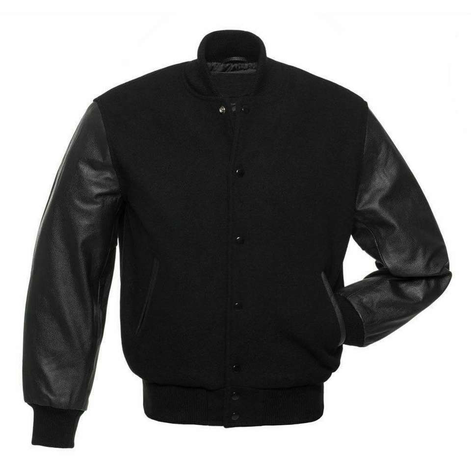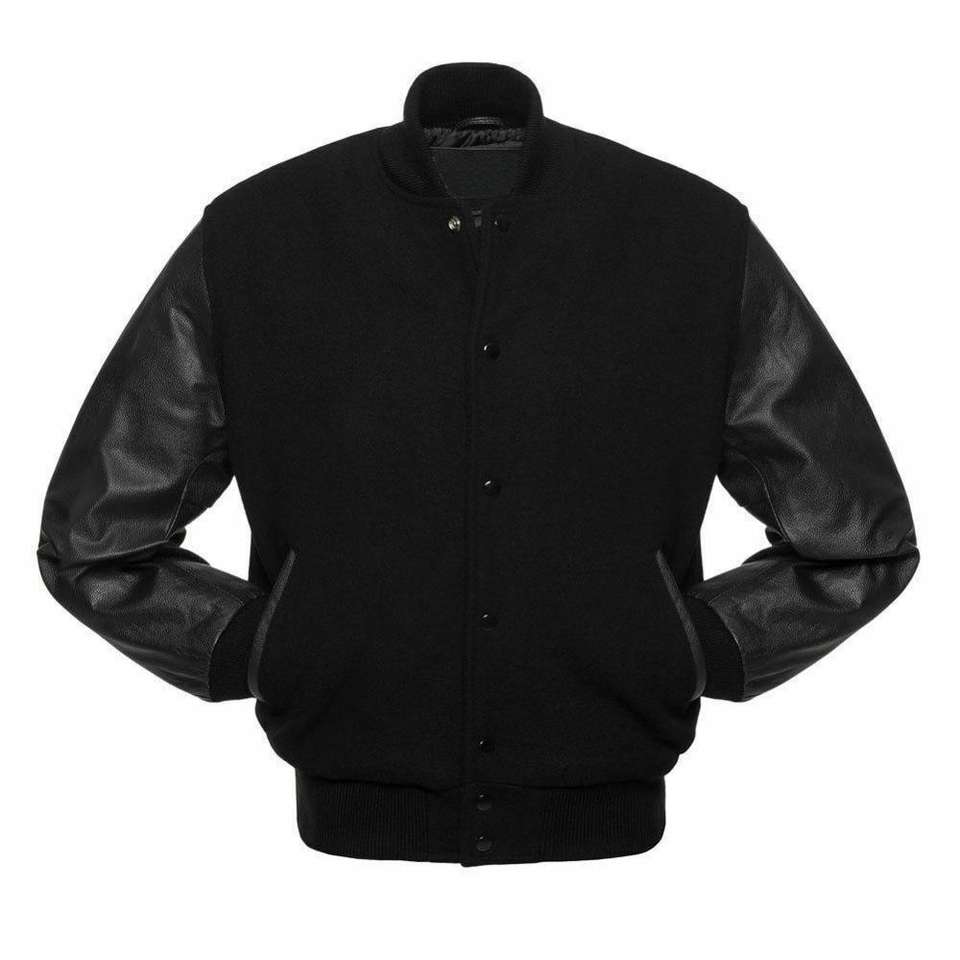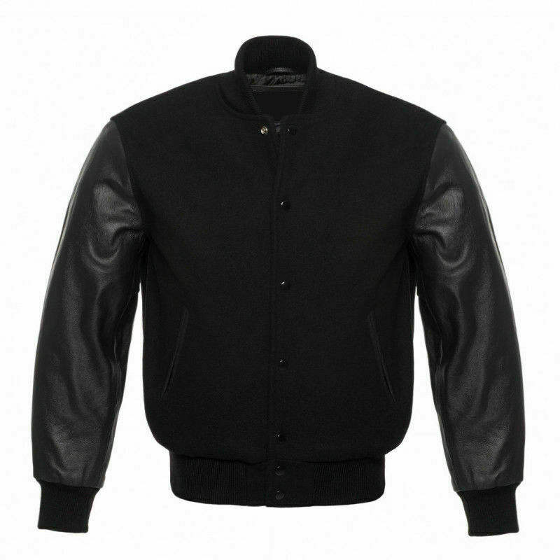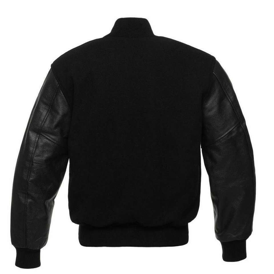 Classic Varsity Letterman Bomber Jacket Black Wool Stand Collar Front Logo Body & Black Sleeves
