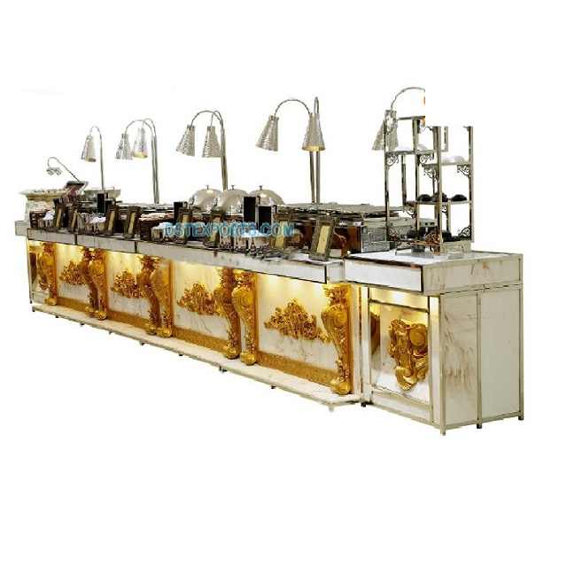 Comptoirs et buffets de restauration classiques pour mariage, en acier inoxydable blanc et doré, comptoirs de traiteur pour fruits, touche dorée, stand de restauration sculpté à la main