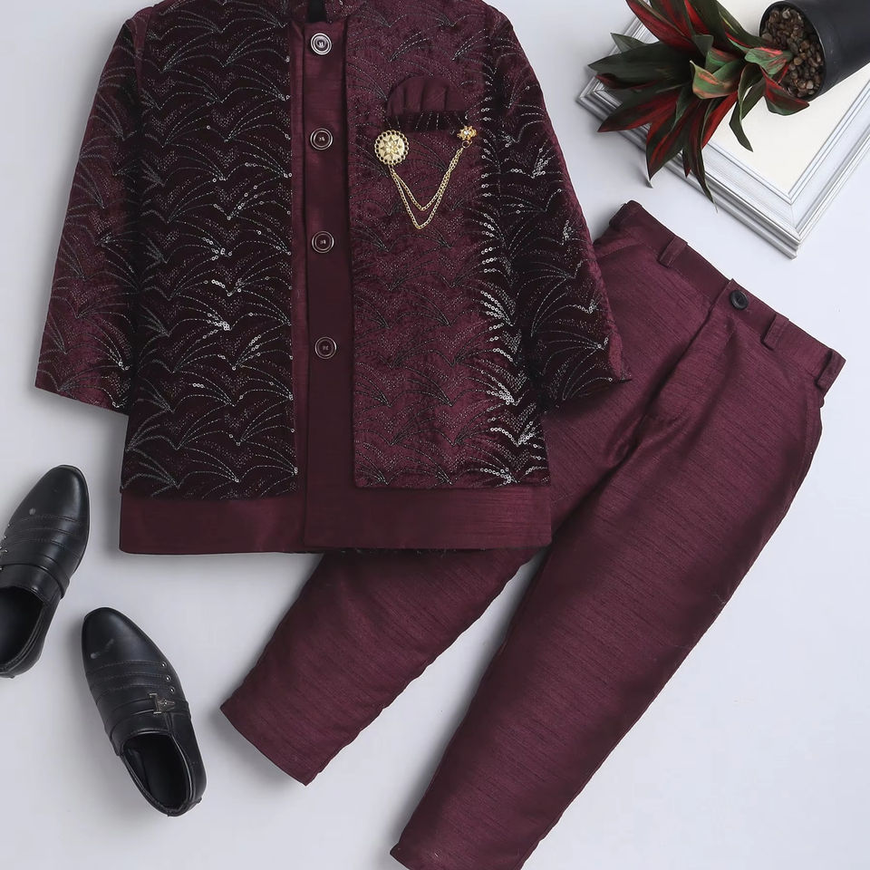 Classic Wedding Party Silk Boys Sherwani Traditional Ethnic Outfit for Children Royal Look Knee-Length Wrinkle-Free Sun