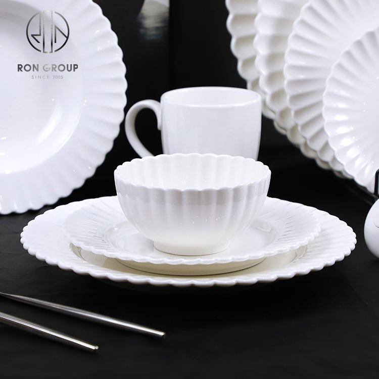 Service de table en céramique blanche classique à bord festonné, plusieurs pièces, assiettes pour tables de restaurant et collections de vaisselle intemporelles