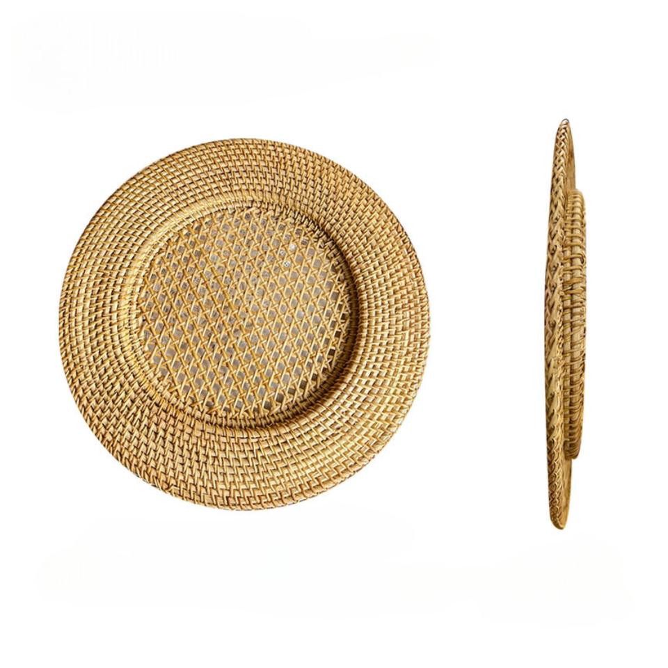 Table d'extérieur en osier classique réglage rotin motif chargeur assiettes fleur Unique pour les événements de mariage dîner nourriture élégante