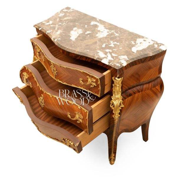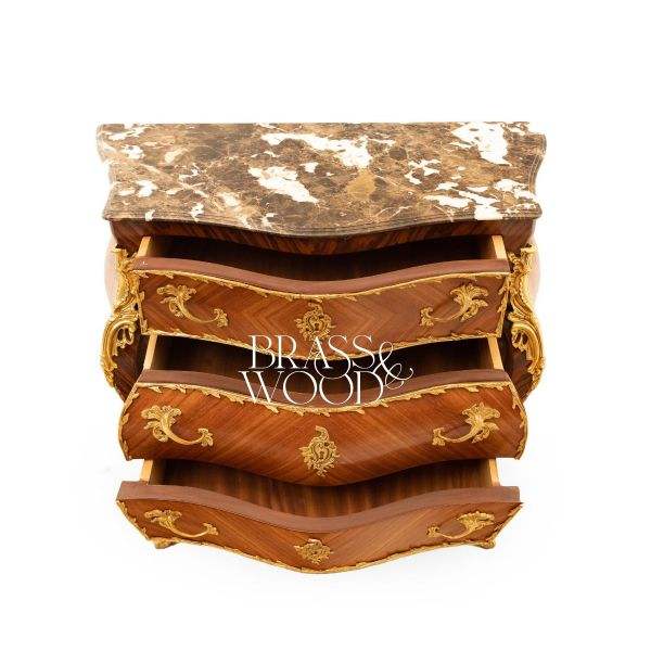Classic Wooden Chest of Drawers with Curved Front Gilded Brass Details and Natural Marble Top Luxury Design