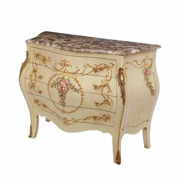 Classic Wooden Chest of Drawers with Hand Painted Floral Motifs Marble Top Curved Luxury European Design