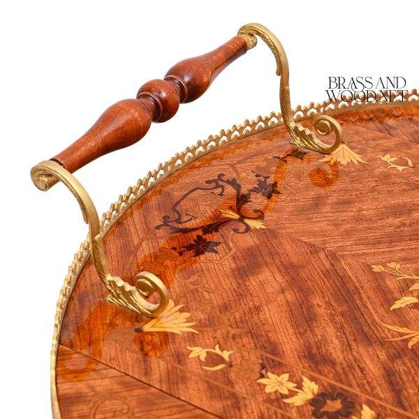 Classic Wooden Tea Trolley With Brass Wheels And Decorative Serving Tray