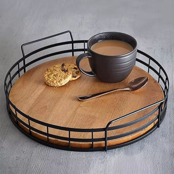 Classic Wooden Tray With Metal Handle For Elegant Food Presentation Providing Strength Style And Long Lasting Usability