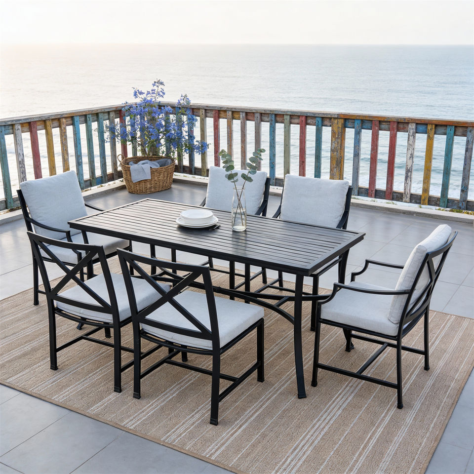 Ensemble de salle à manger d'extérieur de luxe nordique haut de gamme Classic X Back 7 pièces avec structure métallique et couleurs de coussins personnalisables pour patio côtier