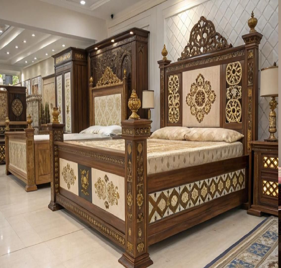 Lit classique avec tête de lit cintrée, grain de bois profond et charme rustique. Disponible à prix de gros.