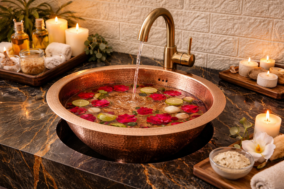 Classic copper pedicure basin Ancient Ayurvedic foot soak bowl Heritage copper foot bath Ethnic copper foot basin