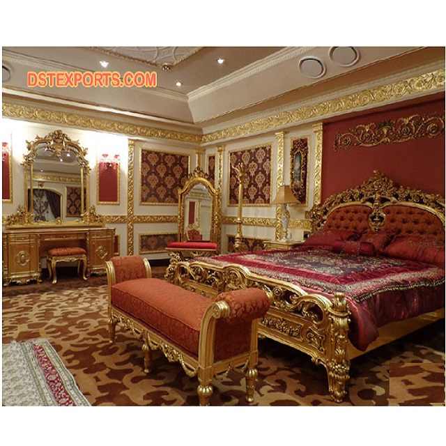 Ensemble de chambre à coucher classique en or sculpté à la main L