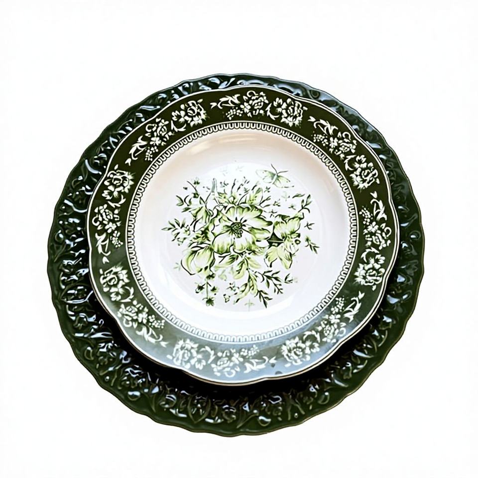 Services de table en céramique rétro européens classiques, assiettes et bols en porcelaine écologiques vert foncé de luxe pour restaurants et hôtels