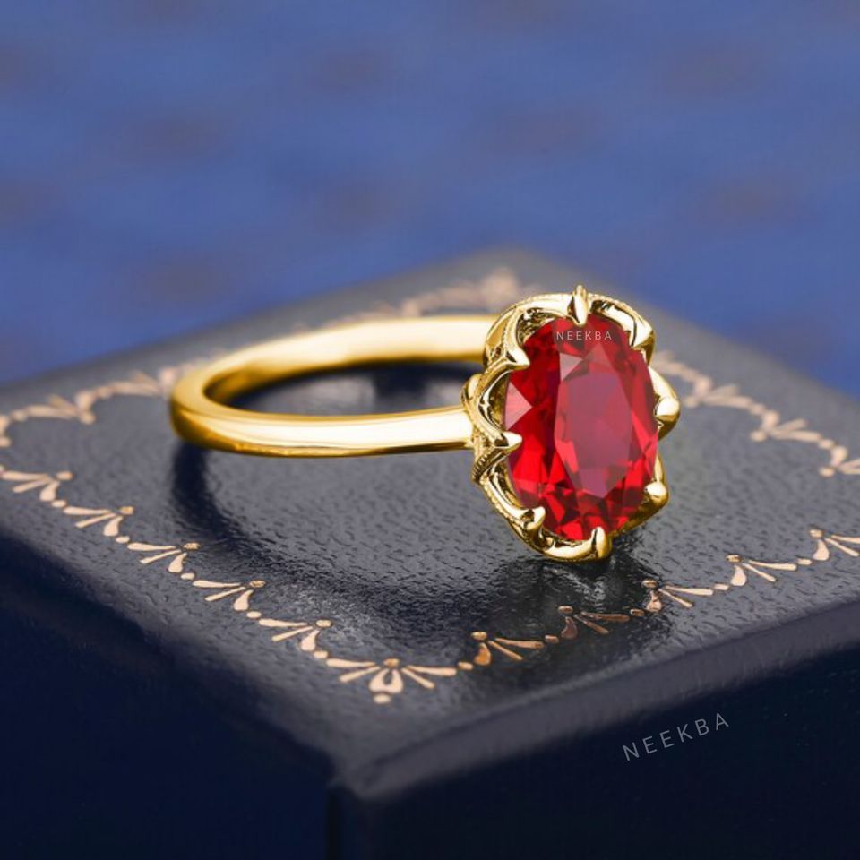 Ensemble de griffes Bague de rubis de laboratoire ovale en or jaune massif 10 carats fabriquée à la main de style Art déco Solitaire Bague de fiançailles en rubis