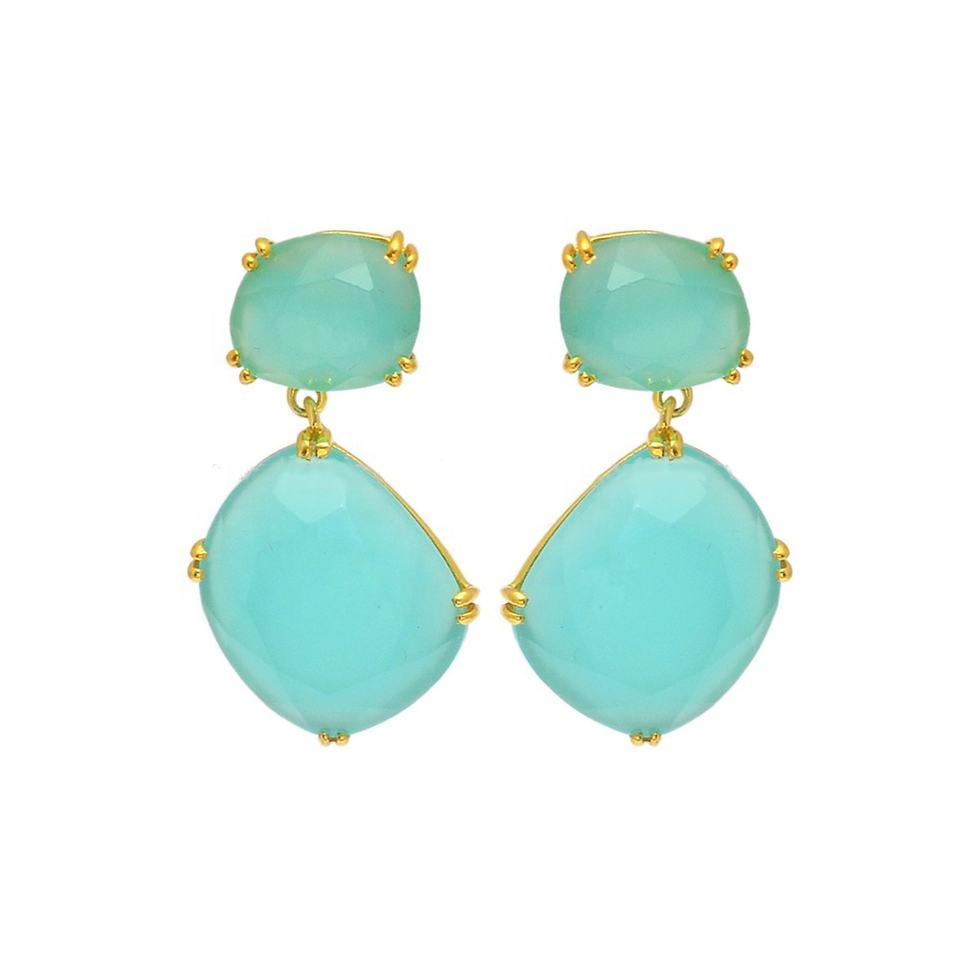 Boucles d'oreilles pendantes faites à la main en argent sterling 925 plaqué or avec double pierre naturelle de calcédoine aqua facettée sertie griffe, qualité supérieure
