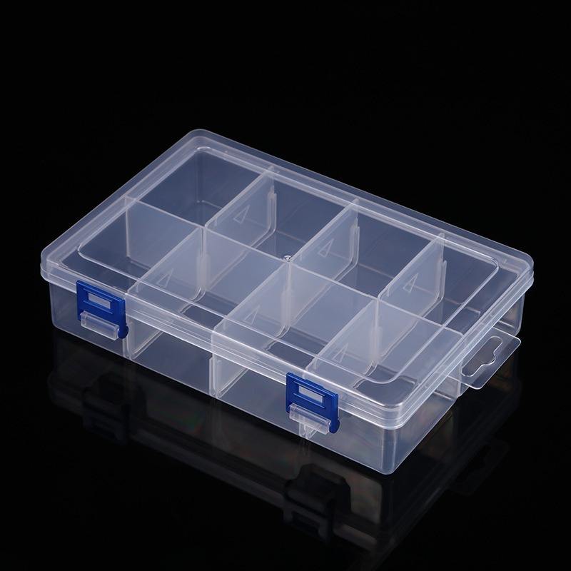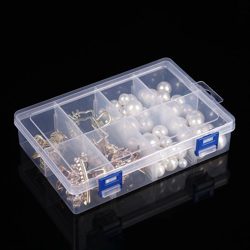 Boîte de rangement en plastique transparente à 8 compartiments avec doubles boucles pour organiser les bijoux, les accessoires de bureau, les pièces et les outils
