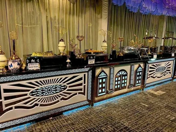 Comptoir de buffet de mariage en cristal clair avec panneaux à bords dorés | Table de présentation de nourriture à LED de luxe pour réceptions et banquets