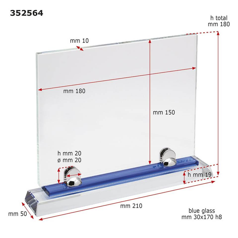 Support de présentation en verre transparent avec base bleue 180x150 mm pour utilisation sur table