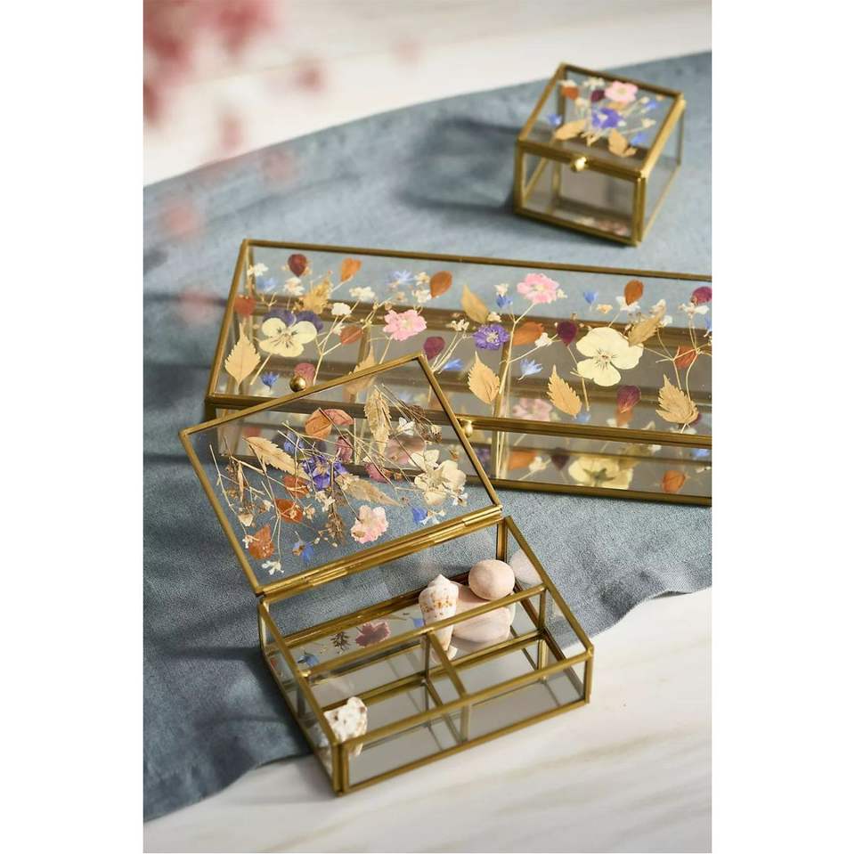 Boîte à souvenirs en verre transparent avec de vraies fleurs pressées | Petite boîte de rangement décorative en laiton, boîte à dragées de mariage, étui à bijoux floral