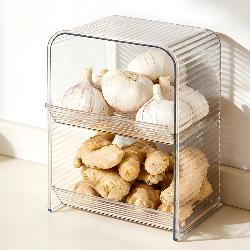 Panier de rangement de cuisine en plastique transparent, forme rectangulaire, avec deux étagères pour organiser le gingembre et l'ail, style simple 8850