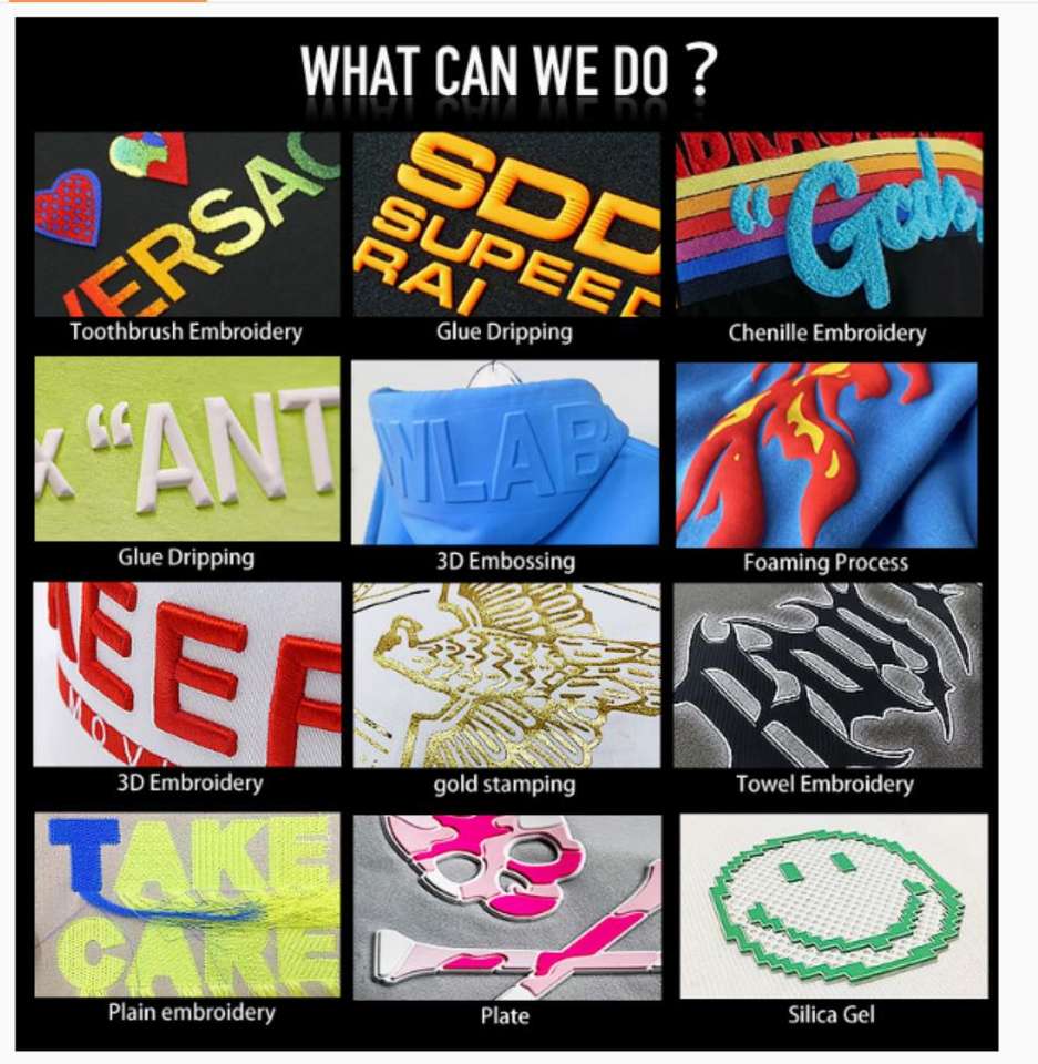 Discharge Printing, Tie-dye, Puff Printing, Embossed, Heat-Transfer Printing, Digital Printing, Silk Screen Printing, DRIPPING, Raised Rubber Print, Sublimation Transfer Print, Glitter Print, Foil Print, None