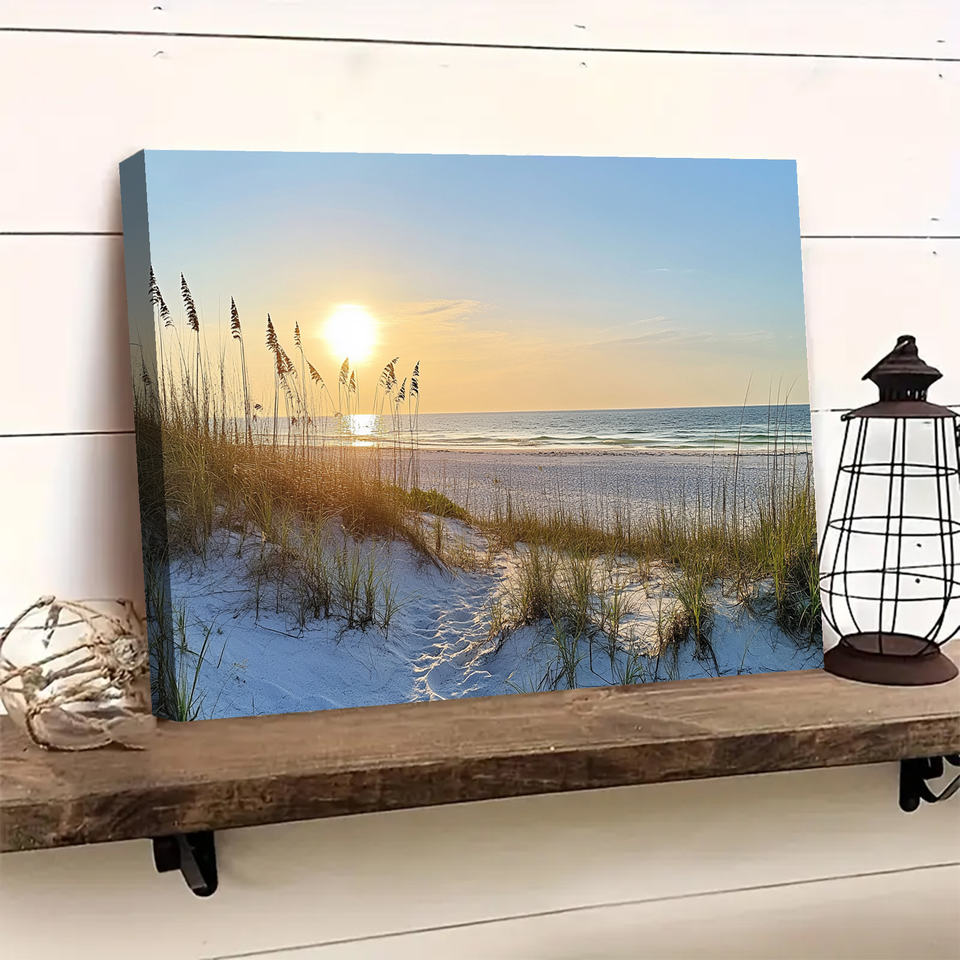 Décor de soirée côtière: coucher de soleil sur la plage de sable et la mer impression toile oeuvre pour la décoration intérieure 1.5 pouces d'épaisseur