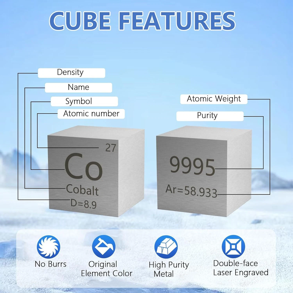Cobalt Cube-Cubes d'éléments métalliques-Ensemble de cubes de densité gravés au laser pour une collection de tableaux périodiques d'éléments