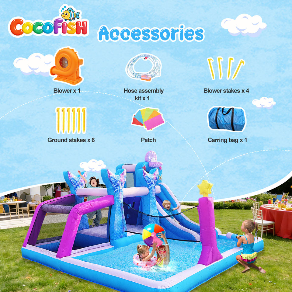 Toboggan aquatique gonflable Cocofish Sirène pour enfants, château gonflable extérieur avec piscine intégrée pour les enfants de 3 à 10 ans