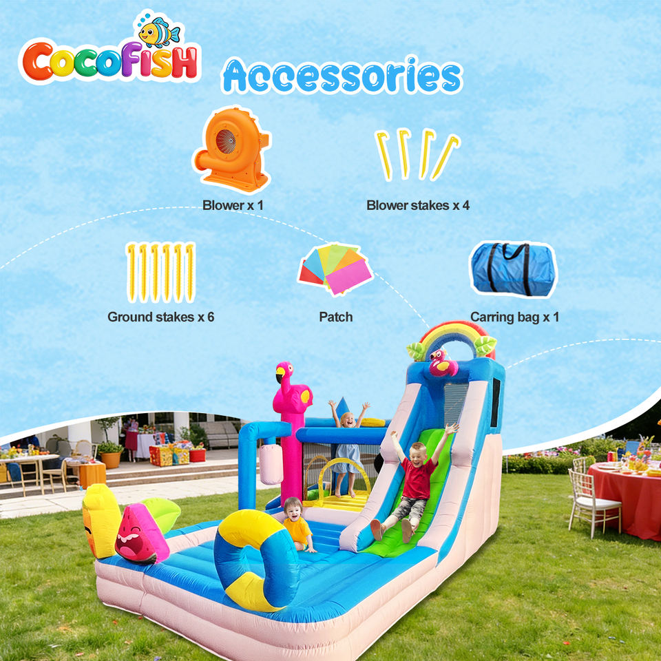 Château gonflable tropical à thème flamant rose Cocofish en gros avec toboggan aquatique et maison de saut gonflable pour enfants avec souffleur
