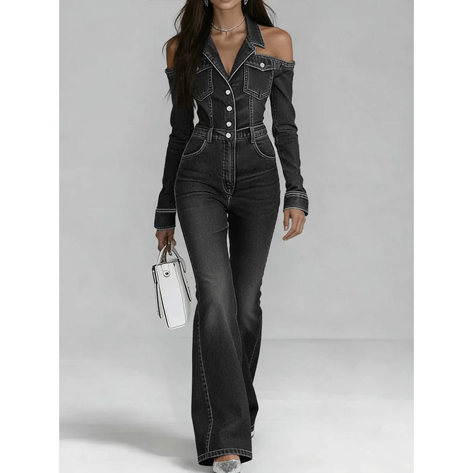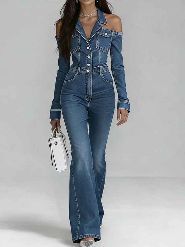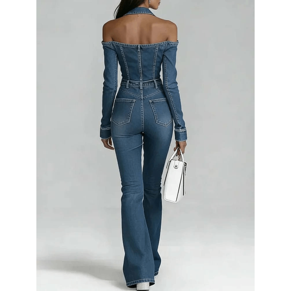 Combinaison en jean évasée à épaules dénudées et détails moto, style catsuit sculpté à épaules dénudées, coupe bootcut
