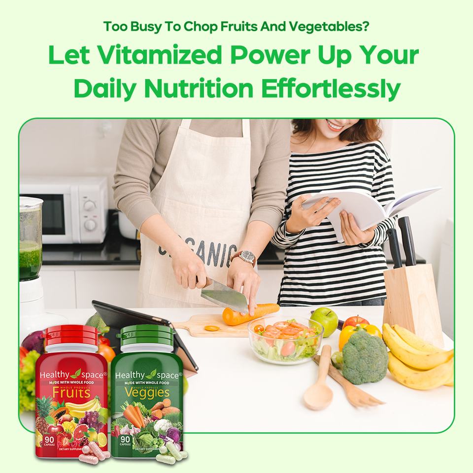 Complément alimentaire en poudre de fruits et légumes pressés à froid, contenant de la vitamine C et des protéines, en pack combiné.