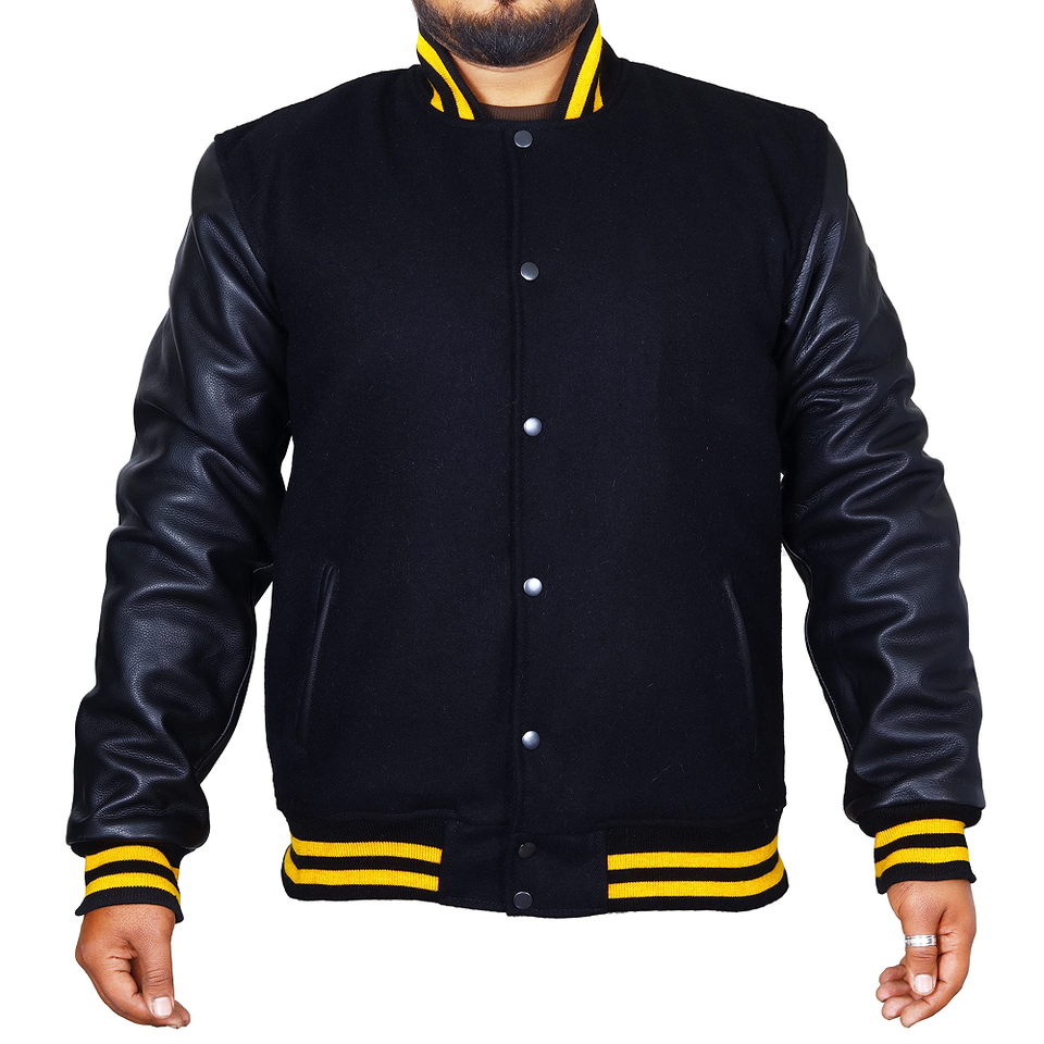 Veste universitaire style Letterman unie avec manches en cuir noir, corps en laine, saison hivernale, décoration boutonnée