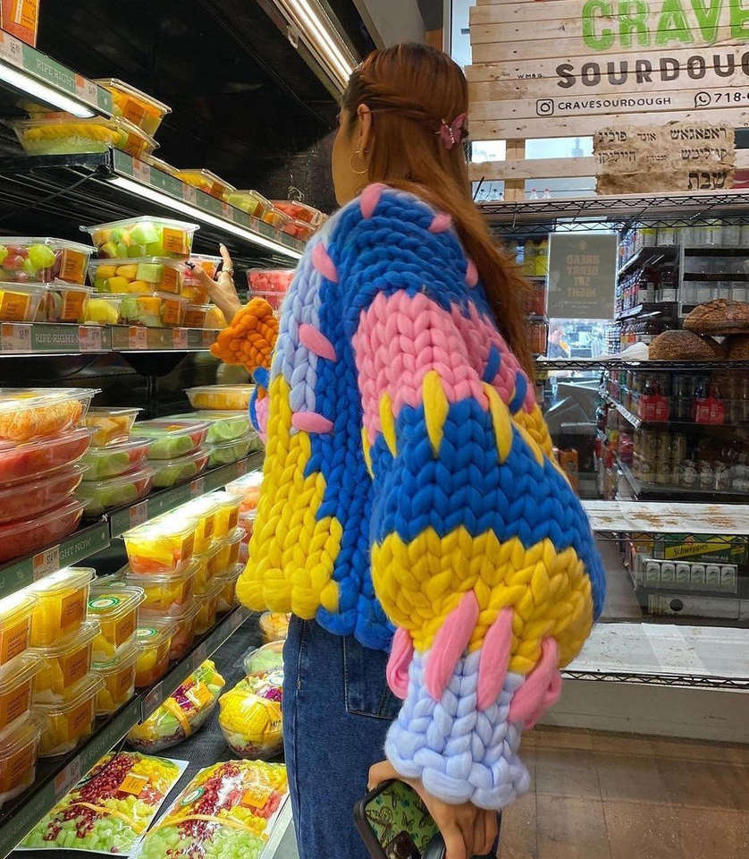 Bloc de couleur arc-en-ciel tricoté Cardigan couche de finition femmes automne et hiver tricot à la main épais Crochet pull
