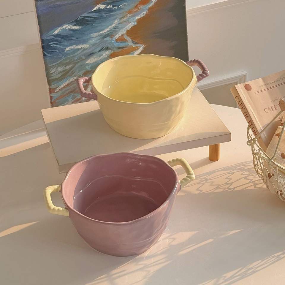 Bol à soupe en céramique à double oreille, style crème, grande capacité, pour usage domestique