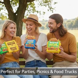 Plateaux en papier sulfurisé personnalisés avec design coloré pour le burger géant cascade de fromage et les frites garnies