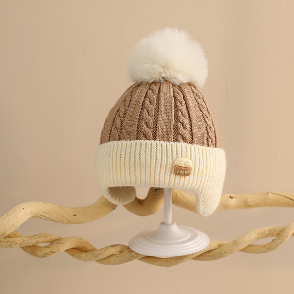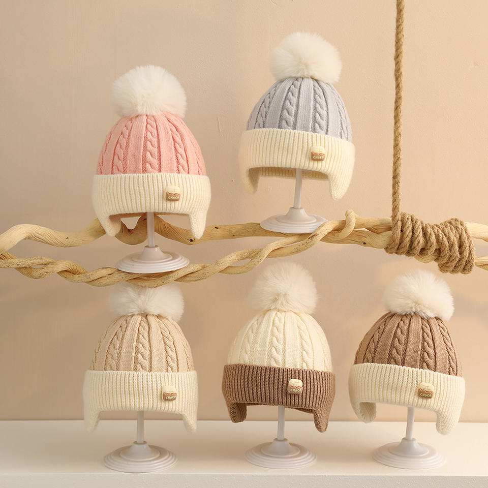 Chapeau d'hiver pour bébé de style coréen assorti aux couleurs, en laine tricotée, chaud, avec un pompon en fourrure, chapeau pour enfants
