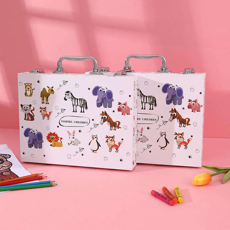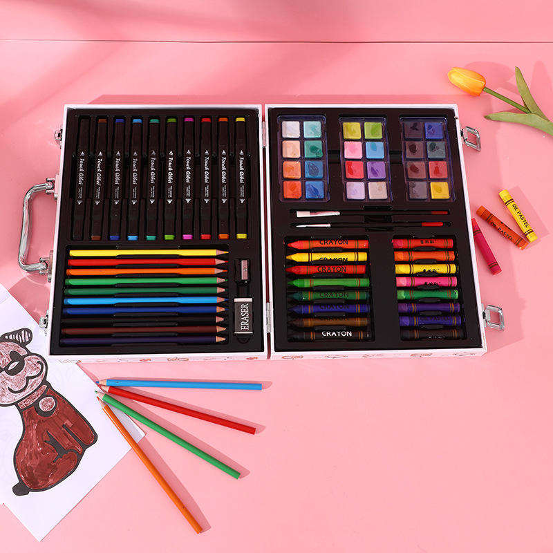 Ensemble d'art en plastique coloré avec des crayons aquarelle, des crayons de couleur, une valise blanche